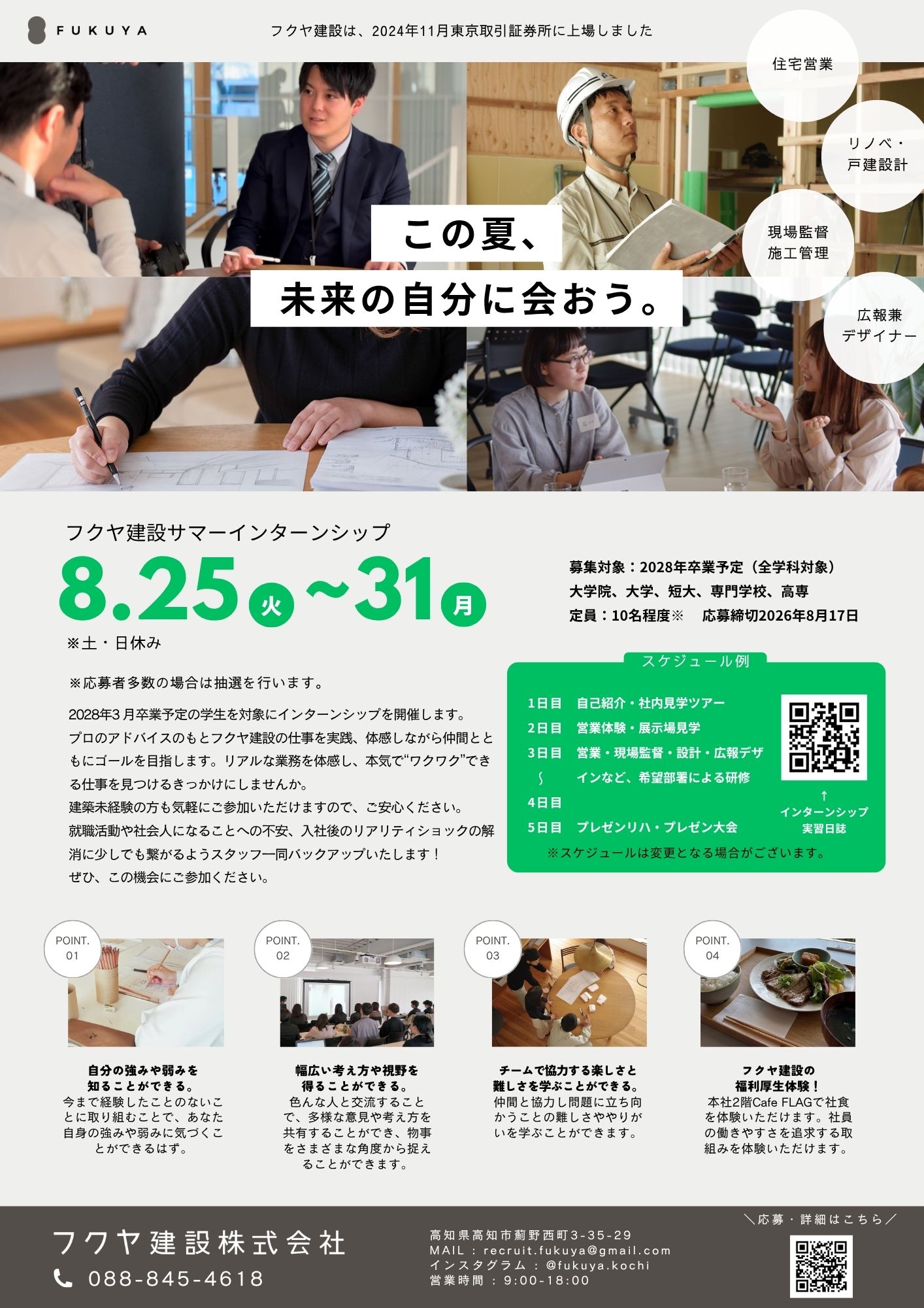 私たちフクヤ建設は、高知に拠点を置く工務店です。ただ、皆様が想像する工務店ではないかもしれません。「衣食住」暮らしの全てにフクヤらしくアプローチをし、フクヤ建設だからこそできることは何かを考え、形にしていくことを常に考えている集団です。